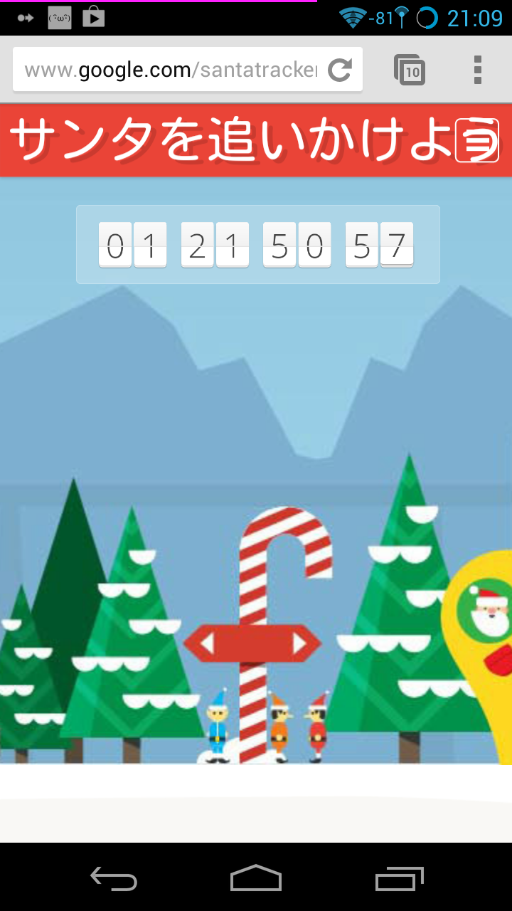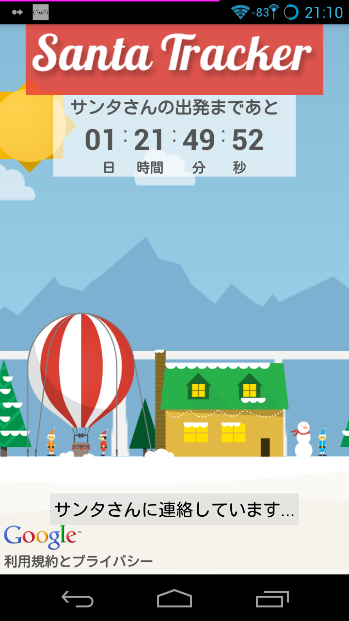 Android 向け Google サンタ追跡アプリでクリスマス気分を盛り上げよう。サンタさんのお手伝いエルフたちが、12 月 24 日に世界中の子供たちにプレゼントを配るサンタさんを追跡するアプリを作りました。詳しくは、http://g.co/santatracker をご覧ください。メリー クリスマス!