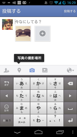ふと、空を見るとヘリコプターが飛んでいて、おおー!と思い、すばやくFacebookアプリを開いて「写真」ボタンを押すとこんな画面となります。