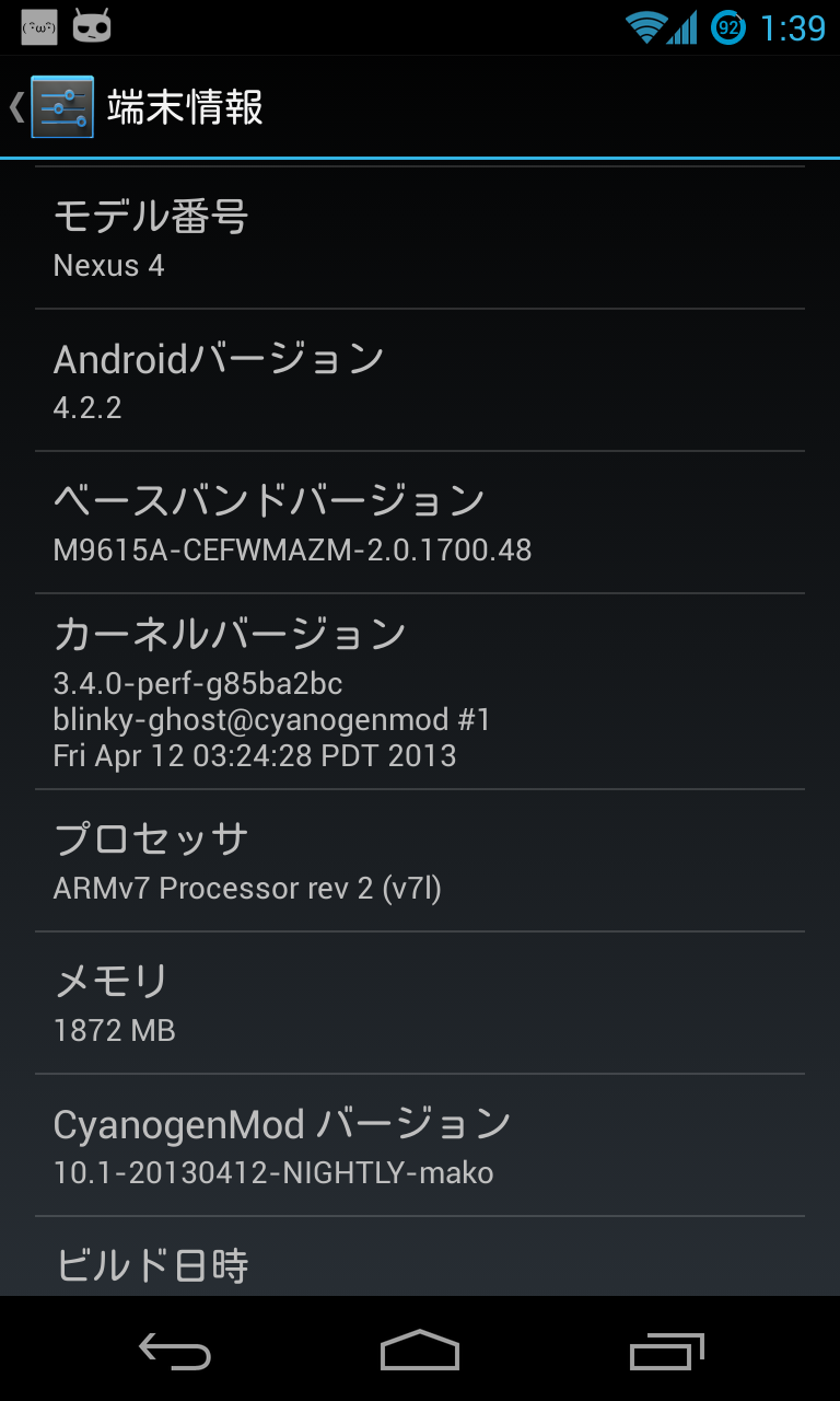 すこし、未だ Stable 未リリースの Nexus4版でしたが、Cyanogenmod。